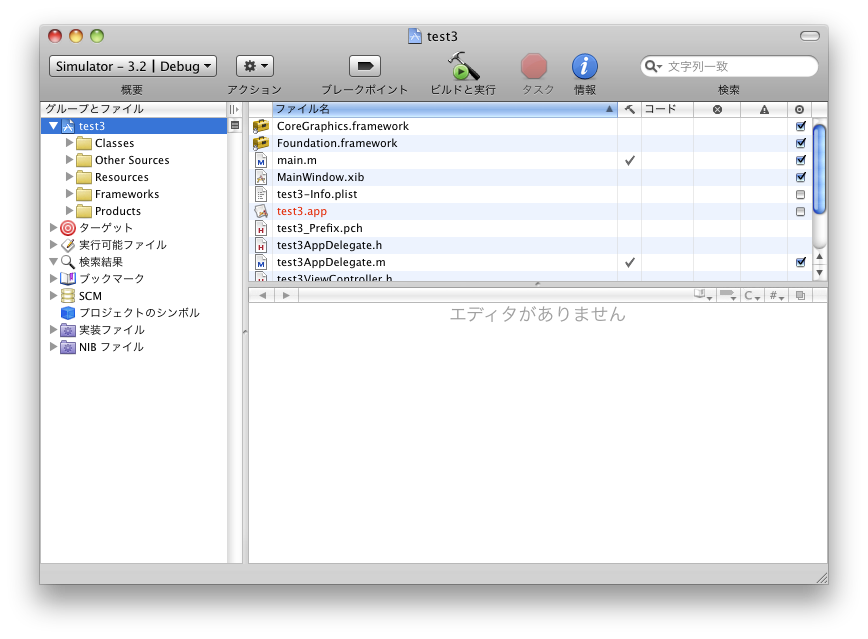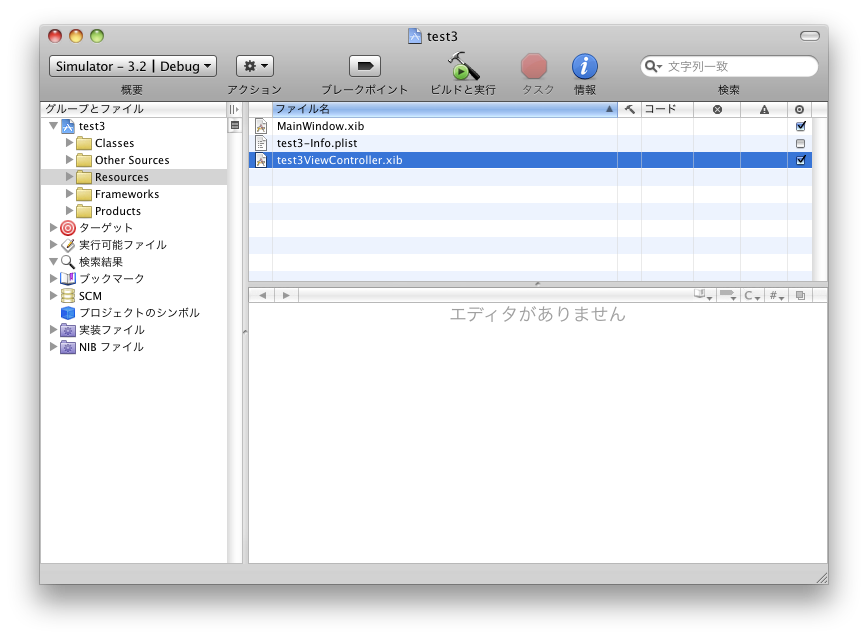 Resources のフォルダで test3ViewController.xib をダブルクリックします。test3がプロジェクト名です。