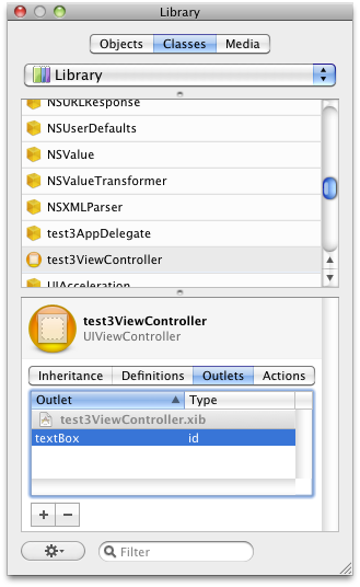 Outlets に追加(左下の+を押す)して名前を textBox にします。