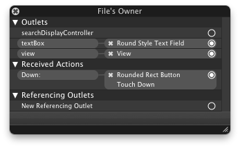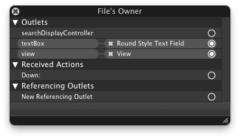 textBox と TextField を結びつけます。下の画面の右側の丸からドラッグしてテキストフィールドで離すと結びつけられます。