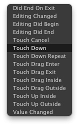 Down と Rounded Rect Button を結びつけます。離すと以下のウインドウが現れるので、Touch Down を選択します。